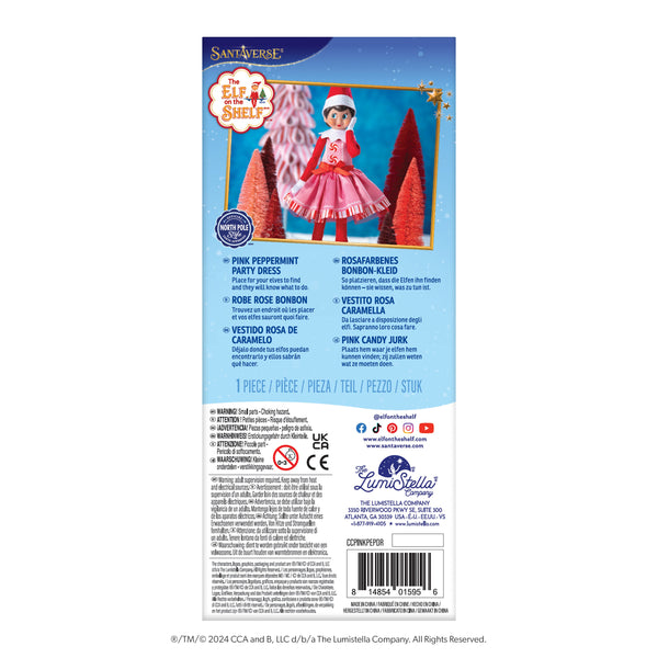 What a treat! Your Scout Elf will be pretty for a party in peppermint pink! With its candy cane-inspired two layer skirt, tiny peppermint discs for buttons and rickrack details, this party dress will have your Scout Elf looking sweet!